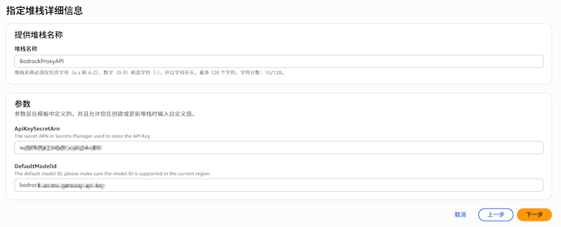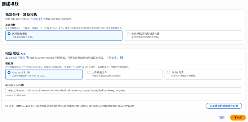 访问官方提供的Amazon CloudFormation 堆栈模板启动链接。登录亚马逊云科技的控制台后,跳转到 Amazon CloudFormation 创建堆栈页面。