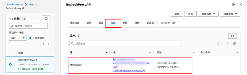部署过程需要大约几分钟,而后在部署完成后,我们再到 CloudFormation 堆栈的输出选项卡找到并记下 API Base URL,,如上图,这里的 URL 将用于后续配置环境变量。
