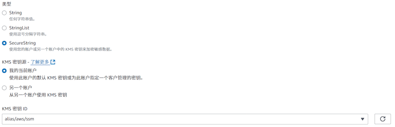 然后在类型中选择 SecureString 类型,KMS密钥源选择"我的当前账户"。