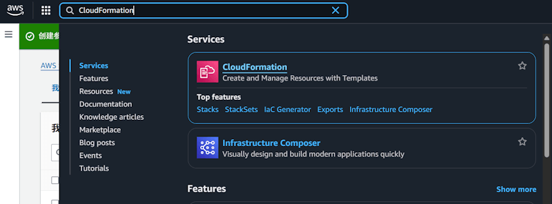 然后我们搜索 CloudFormation ,去实现部署Bedrock Access Gateway。